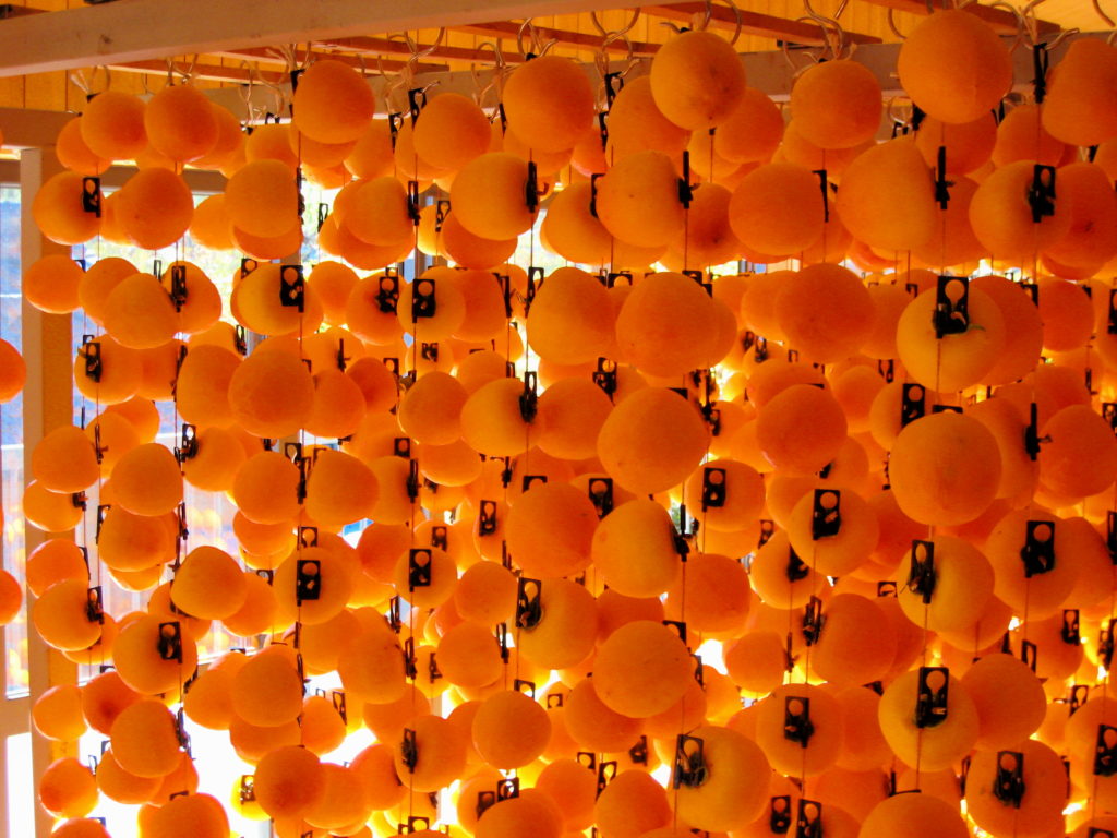 柿は日本原産の長寿で縁起の良い木です。特に干し柿は、和菓子の原点と言われ、冬の貴重な保存食でもあり、「福をかき集める」とか、善きことが来るという意味で「嘉来」という字があてられ、お正月を祝う縁起物として古くから欠かせないものでした。